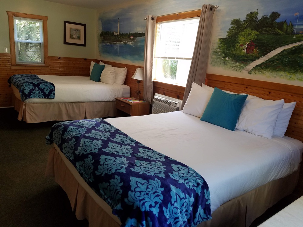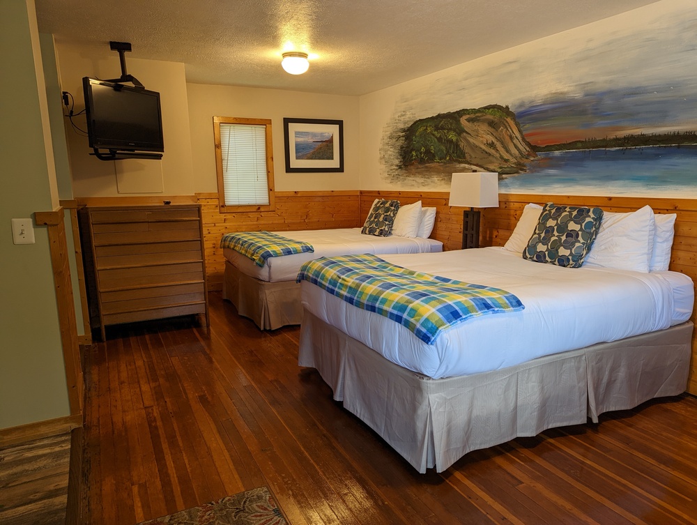 Two queen beds, Kitchenette has refrigerator, microwave, coffee maker, two burner electric range, sink, dishes and utensils.
