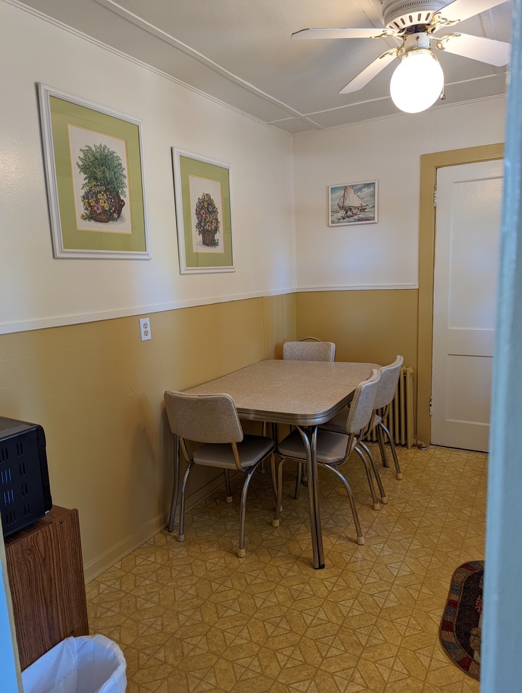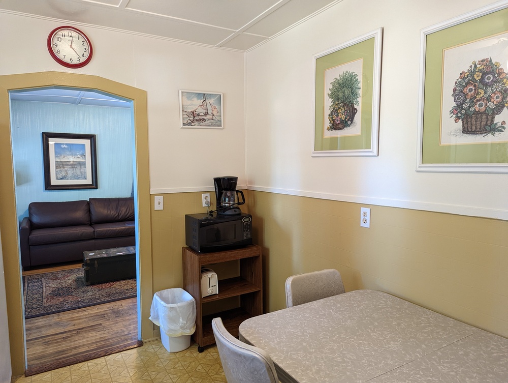 Dog friendly Two queen beds,. Kitchenette has refrigerator, microwave, coffee maker, two burner electric range, sink, dishes and utensils.